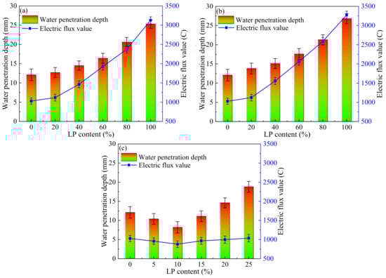 The influence of LP content on the water penetration depth and chloride electric flux value of concrete after 28 days of curing can be seen in Figure 5.