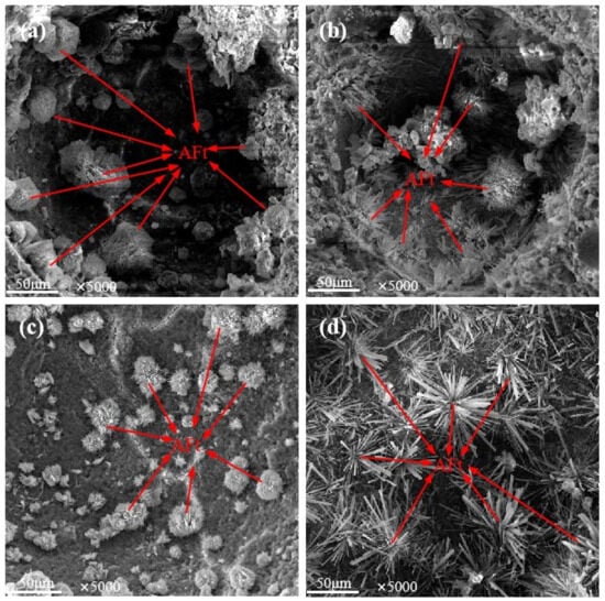 The microstructure of Aft in concrete pores is illustrated in Figure 6, which clearly shows that a large number of AFt crystals grow outwards along the inner wall of the pores in clusters or fibrous rods. The comparison in Figure 6a,c shows that the AFt crystals of JZ0 and LFS20 were interwoven into yarn balls and filled the internal pores of the concrete, but the AFt size of LFS20 was smaller than that of JZ0. It is clear from Figure 6b,d that the AFt crystals of LF20 and LS10 grew outward along the inner wall of the pore and crisscrossed to form a complex network structure that occupied the inner space of the pore. Compared with JZ0 and LFS20, the AFt crystals of LF20 and LS10 were abundant and larger in size, and the spatial network structure was complex, which is more conducive to improving the strength and durability of concrete.
