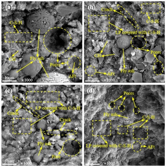 The internal microstructure of concrete is shown in Figure 7. It is shown that the presence of AFt, C-S-H gels and unhydrated FA particles in the concrete. CH was also found in JZ0 and LF20, as shown in Figure 7a,b. In a comparison of Figure 7a–c, it was found that there were large pores in JZ0, LF20 and LFS20, and the pores in JZ0 were filled by Aft. Compared with JZ0, micro-cracks existed in both LF20 and LFS20, and the cracks in LFS20 were wider and more numerous. This corresponds to results of the low compressive strength and poor impermeability of LFS20 in the macroscopic properties. In addition, compared with JZ0, C-S-H gel covering the surface of LP particles was observed to grow in LF20, LFS20 and LS10. This is because the Ca and O atoms in the crystal structure of LP are similar to the planar configurations in C-S-H gel, which can provide a good nucleation growth site for C-S-H gel [3]. At the same time, LP particles, C-S-H gel and needle-rod AFt overlap each other and fill the internal space of the concrete. In particular, a structure with smaller pore volumes and denser matrixes can be clearly observed in LS10. This is consistent with the result that this concrete had the highest strength and the best impermeability.