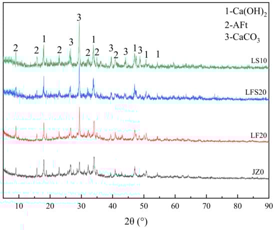 The XRD patterns of JZ0, LF20, LFS20 and LS10 at 7 d are shown in Figure 8. As the amount of LP in LF20, LFS20 and LS10 increased gradually, the peak intensity of calcium carbonate in the XRD image gradually increases, and the order is LF20 < LFS20 < LS10. The presence of calcium carbonate in JZ0 may have been caused by carbonization. LF20 and JZ0 had similar CH peak intensities and LFS20 and LS10 had little difference in their CH peak intensities, but compared with JZ0, the CH peak intensity increased. This indicates that more CH was generated by cement hydration in the LFS20 and LS10 samples. Compared with LFS20, the AFt peaks in JZ0, LF20 and LS10 were more obvious, and the AFt peaks in LF20 and LS10 were stronger than those in JZ0. This indicates that AFt was abundant in LF20 and LS10, which also confirms the results observed in the SEM image. This is attributed to the nucleation action of LP, which accelerates the initial hydration process of cement and provides abundant CH for the expansion agent, thus promoting the hydration of the expansion agent [52]. The macroscopic properties show that the concrete strength and constrained expansion rate of LF20 and LS10 were increased.