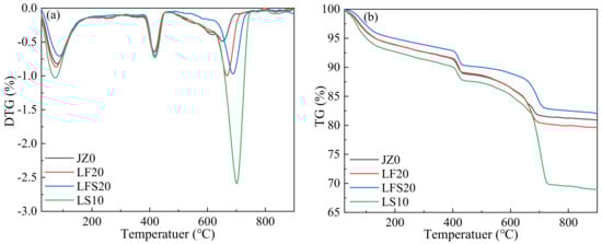 The TGA test results of the cement paste samples of JZ0, LF20, LFS20 and LS10 with curing ages of 7 d are shown in Figure 9.