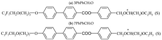 - Tomczyk, W.; Marzec, M.; Juszyńska-Gałązka, E.; Węgłowska, D. Mesomorphic and physicochemical properties of liquid crystal mixture composed of chiral molecules with perfluorinated terminal chains. J. Mol. Struct. 2017, 1130, 503–510. [Google Scholar] [CrossRef]