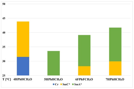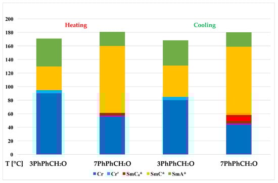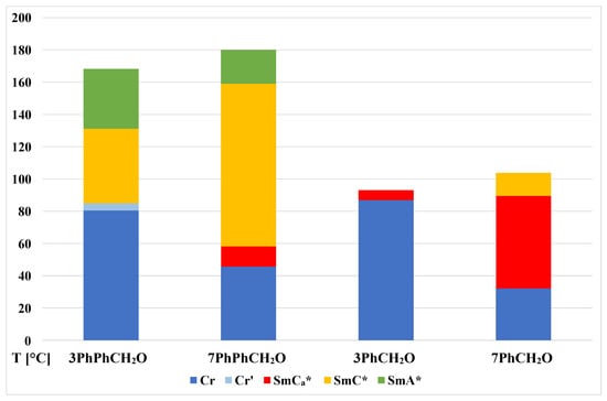 | 7PhPhCH2O | Cr | 51.6–58.6 | SmCa* | 60.7–63.1 | SmC* | 158.2–162.8 | SmA* | 179.1–183.6 | Iso |