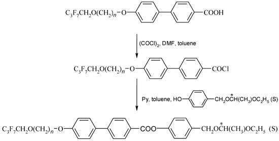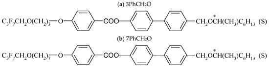 - Drzewiński, W.; Dąbrowski, R.; Czupryński, K. Orthoconic antiferroelectrics. Synthesis and mesomorphic properties of optically active (S)-(+)-4-(1-methylheptyloxycarbonyl)phenyl 4′-(fluoroalkanoyloxyalkoxy)biphenyl-4-carboxylates and 4′-(alkanoyloxyalkoxy)biphenyl-4-carboxylates. Pol. J. Chem. 2002, 76, 273–284. [Google Scholar] [CrossRef]