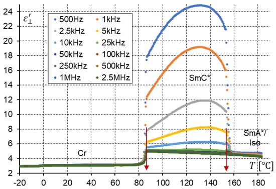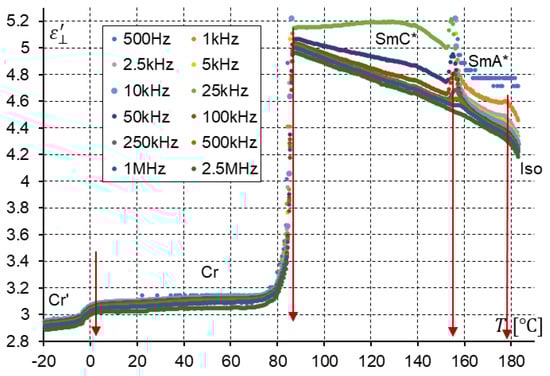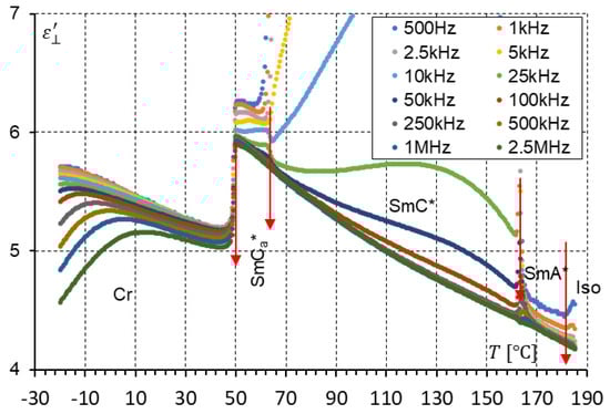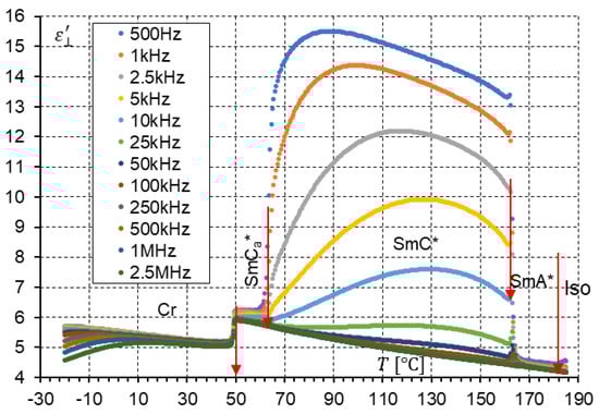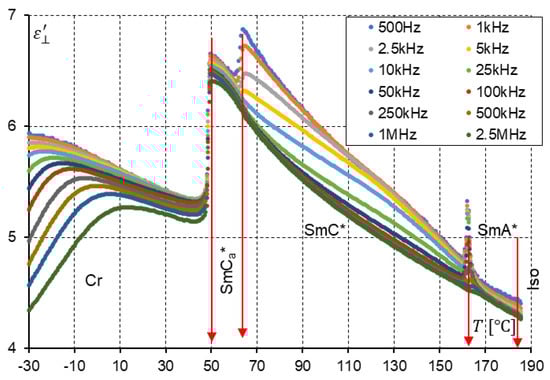 - Perkowski, P.; Mrukiewicz, M.; Herman, J.; Kula, P.; Jaroszewicz, L. Dielectric investigation of the liquid crystal compound with the direct SmA*-SmCA* phase transition. Liq. Cryst. 2016, 43, 654–663. [Google Scholar] [CrossRef]