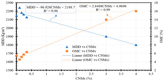 Correlation between maximum dry density (MDD) and carbon nanomaterials (CNMs); correlation between optimum moisture content (OMC) and carbon nanomaterials (CNMs).