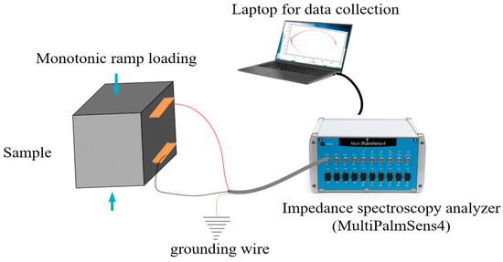 The sensing capability of self-sensing cementitious composites relies on creating conductive pathways by incorporating conductive fillers. Consequently, alterations in the microstructure of self-sensing cementitious composites lead to modifications in the state of these conductive pathways, resulting in changes in the impedance of the self-sensing cementitious composites. To assess the electromechanical performance of self-sensing cementitious composites with respect to their microstructural components and their corresponding variations, electrochemical impedance spectroscopy (EIS) can be employed. To achieve this objective, EIS measurements were conducted during the application of monotonic ramp loading, as illustrated in Figure 5. The impedance data were collected using an impedance analyzer (MultiPalmSens4, manufactured by PalmSens Bv) under various compressive stress levels, including 0 kPa, 320 kPa, 1276 kPa, 3188 kPa, and post-failure conditions. In the context of electrochemical impedance spectroscopy (EIS) analysis, a two-electrode measurement system was employed, a choice consistent with prior research that has validated the dependability of EIS outcomes using this specific two-electrode configuration [74].