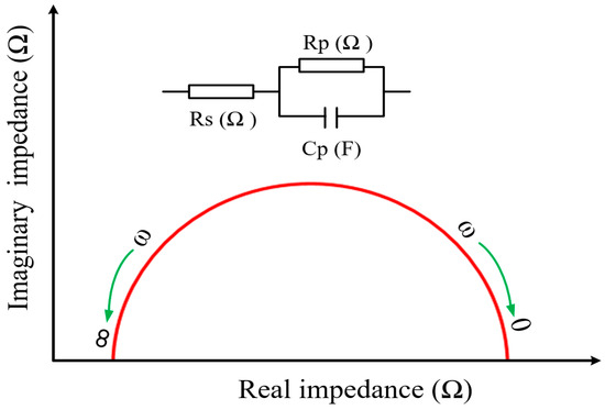 The Nyquist plot is a commonly used plot for evaluating microstructural changes in cementitious composites based on EIS measurements. Figure 6 illustrates a single Nyquist plot featuring resistance (Rs, Rp) and capacitance (Cp) elements in a semicircular shape, commonly called a capacitive loop. Within the schematic model depicted in Figure 6 for a cementitious material, the symbol Rs represents the combined resistance of the solid and liquid phases, while Rp and Cp depict the interfacial resistance and capacitance associated with the interface between the solid and liquid phases, respectively [75]. The Nyquist plot depicts the relationship between the real impedance (Z′) and the imaginary impedance (Z″) across a range of frequencies. It is important to emphasize that the configuration of the Nyquist plot can exhibit various shapes and quantities, contingent upon the components and microstructural state of cementitious composites. Consequently, there is no universally accepted equivalent circuit model for cementitious composites, and multiple equivalent circuits are available for characterizing cementitious composites.