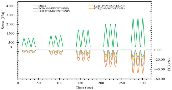 Furthermore, as depicted in Figure 8, it becomes apparent that at an equivalent level of cyclic compressive stress, the variation in the FCR becomes more pronounced as the proportion of MWCNTs/GNPs increases. This phenomenon signifies an enhancement in the self-sensing ability of the material with increasing concentration of conductive fillers. Incorporating a higher concentration of conductive fillers into cement-stabilized sand leads to an increase in the conductive pathways within the self-sensing cementitious composite. As illustrated in Figure 8, increasing the percentage of conductive fillers augments the sensitivity of the self-sensing cementitious composite due to the abundance of conductive pathways. In summary, the stress-sensing capacity of the self-sensing cementitious composite exhibits an upwards trend in response to the escalation of conductive filler concentration.