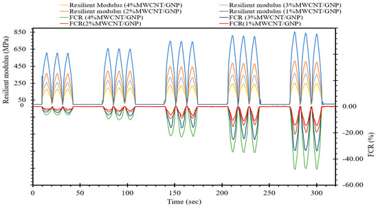 Considering the procedure outlined in Figure 9, we calculated the resilient modulus of self-sensing cementitious composites and depicted its relationship with the FCR over time in Figure 10. As depicted in Figure 10, it becomes evident that over time, the FCR of self-sensing cementitious composites containing various MWCNTs/GNPs increases and decreases with increasing and decreasing resilient modulus, respectively. It should be noted that the cyclic stress levels employed in this study to assess stress/strain-sensing behavior fall within the quasi-elastic range of the self-sensing cementitious composite. This condition (i.e., stress level within the quasi-elastic region) leads to an increase in the resilient modulus with increasing deviator stress level, resulting in an augmentation of the FCR variations with an increasing resilient modulus over time, as shown in Figure 10. A comparable pattern (an increase in the resilient modulus with rising deviator stress) was also documented in a prior research investigation [76]. However, in certain instances, when the resilient strain increases in response to elevated stress levels, the resilient modulus exhibits a reduction with increasing deviator stress levels [77].