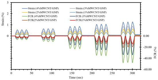 Figure 11 displays the strain detection capabilities of a self-sensing cementitious composite when subjected to repetitive loading within the quasielastic range. The strain increases as the cyclic compressive load intensifies, leading to an increase in the FCR changes, as indicated in Figure 11. This increased cyclic compressive loading disrupts the microstructures and conductive pathways, increasing the FCR changes. Nonetheless, the cyclic compressive loading applied within the quasielastic range induces quasielastic strain, allowing the strain to recover after each unloading step, thereby preventing any drift. It is worth noting that this study focuses solely on the strain-sensing performance of the self-sensing cementitious composite, while an evaluation of damage sensing can be found in a previously published study. Furthermore, as depicted in Figure 11, it becomes apparent that the fluctuation in the FCR (fractional change in resistance) during cyclic strain shows a noticeable increase with increasing MWCNT/GNP content percentage. This increase in MWCNT/GNP content gives rise to amplification in conductive pathways, thereby enhancing strain-sensing capabilities.