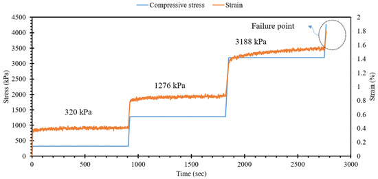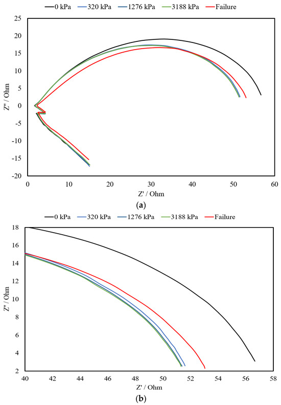 Electrochemical impedance spectroscopy (EIS) is a nondestructive technique extensively employed for assessing the electrochemical characteristics of cementitious composites. EIS proves to be a valuable methodology for discerning alterations in the microstructure of cementitious composites induced by a variety of factors, including curing conditions, types of cementitious materials, fluctuations in moisture content, variations in temperature, and changes in fabric composition [61,64,74,85]. Consequently, it is evident that EIS can be effectively utilized to appraise the impact of external loading on the deformation of the microstructure in self-sensing cementitious composites. To this end, a self-sensing cementitious composite incorporating 3% MWCNTs/GNPs was subjected to a stress path, as depicted in Figure 12, to investigate the EIS response under different stress levels. The EIS data were collected at stress levels of 0 kPa, 320 kPa, 1276 kPa, and 3188 kPa and beyond the point of structural failure, as illustrated in Figure 12.