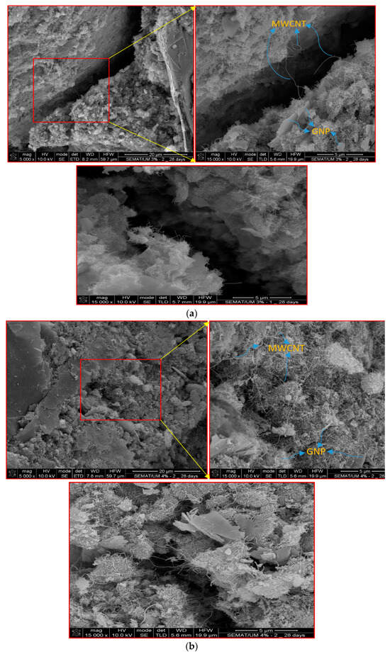 As shown in Figure 14a, the bridging effects of MWCNTs are evident, connecting two sides of a microspace within the specimen containing 3% MWCNTs/GNPs. This bridging effect contributes to the sensory capabilities exhibited by the self-sensing cementitious composite. On the other hand, Figure 14b illustrates the overlapping arrangement of MWCNTs, where they intersect with each other in the self-sensing cementitious composite containing 4% MWCNTs/GNPs. This configuration enhances the composite’s stress/strain-sensitivity performance more in comparison to the self-sensing cementitious composite containing 3% MWCNTs/GNPs. Additionally, the presence of graphene nanoplatelets (GNPs) is noticeable in both Figure 14a,b, serving to fill microgaps within the structure.