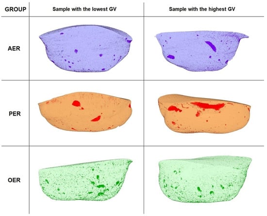 Significant differences between the gaps in external and internal parts of the tooth–filling interface were only noted in the control groups, where significantly higher gap volumes were obtained in the external part for the CSE group (0.321 mm3, p = 0.0019) and for the OER group (0.279 mm3, p = 0.0024). The mean EGV and IGV values and standard deviations are presented in Table 3.