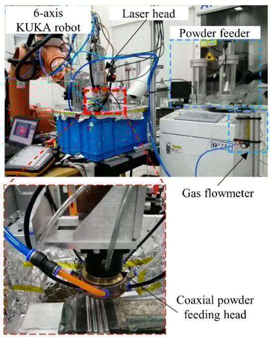 Single-track cladding experiments were carried out using an IPG fiber laser system with a maximum output power of 10 kW and a wavelength of 1070 nm. The laser spot diameter was set as 4 mm with a defocus distance of 40mm from the substrate. A coaxial powder feeding nozzle was used as the powder and atmosphere gas feeder, and argon gas was employed as a shielding and powder-carrying gas. The actual image of the experimental set was shown in Figure 2, and the detailed structure of the nozzle can be obtained from our previously published paper [28]. Both the laser and the nozzle were fixed to a six-axis KUKA robot system. The processing conditions were listed as follows: the laser power (P) was 4200–5400 W with an interval of 300 W; the laser scanning speed (V) was 20–50 mm/s with an interval of 10 mm/s; the powder feeding rates (F) were 25 g/min, 35 g/min, and 50 g/min; and the inner shielding gas flow rate, outer shielding gas flow rate, and carrying gas flow rate were 15 L/min, 15 L/min, and 8 L/min, respectively.