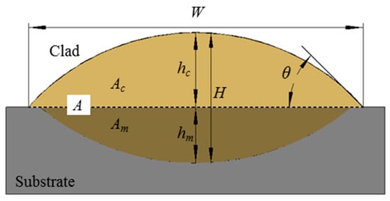 Nine geometrical parameters (the clad width (W), the area of the clad above the substrate (Ac), the area of the molten substrate (Am), the total area of the cross-section (A), the total height of the cross-section (H), the clad height above the substrate (hc), the penetration depth (hm), the clad angle (θ), and the dilution ratio (D)) of the cross-section morphology of the clad illustrated in Figure 3 were measured using imageJ2 software.