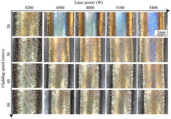 Figure 4 shows the single cladding tracks conducted under a powder feeding rate of 50 g/min, and Figure 5 shows the single cladding tracks conducted under laser power of 4200 W. The global features and surface states of the clad are evaluated first. Judging from the top view of the clad, stable cladding can be achieved. The unmelted powder can be observed and becomes the main index for evaluating the quality of the process. The number of unmelted particles adhered to the surface of the clad decreases with the increase in laser power and increases with the increase in cladding speed. When the powder feeding rate is 50 g/min and the laser power is 4200 W, a lot of unmelted particles are bonded to the surface of the clad and its surrounding areas, which indicates that the laser energy is insufficient relative to a high powder feeding rate. In the cladding process, the powder is heated from two aspects: absorption of laser energy during the transmission process between the substrate and the molten pool and energy absorption after entering the melt pool. Increasing the laser power, on the one hand, increases the energy absorbed by the powder during the flight process and, on the other hand, increases the temperature of the molten pool. As a result, increasing the laser power is an important means to obtain a smooth cladding surface morphology.