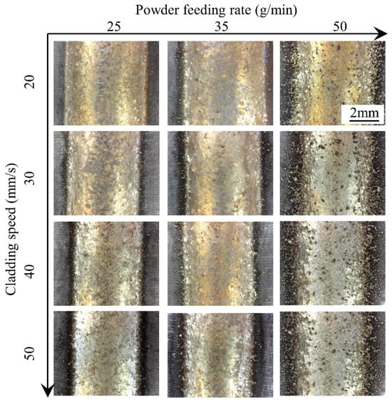 Top surface morphologies of the clads under different powder feeding rates and cladding speeds.