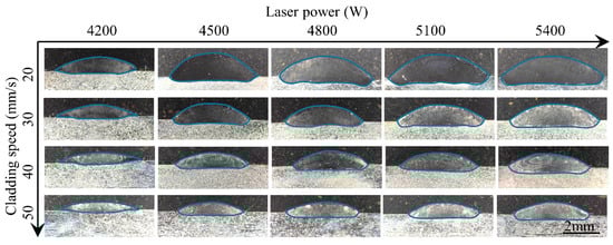 Figure 6 and Figure 7 show the cross sections of the clad under different process parameters. Here, the nine geometrical characteristics explained in Section 2 are employed. The wetting angle is an important feature of the clad morphology and determines the lapping quality of multi-track and multi-layer cladding. If overlapping the clads are too convex, the likelihood of internal porosity is very high. In this study, the contact angle is less than 50°, indicating a good bonding strength between the adjacent clads in the multi-track cladding. The dilution ratio is a crucial parameter to evaluate the quality of the clad since it influences the chemical composition of the coating and the bonding strength between the clad and the substrate [29]. Distinguished by the morphology of the solid–liquid interface fusion line of the cross section, the melt pool can be divided into three types: shallow dilution (such as 50 mm/s and 50 g/min), flat dilution (such as 50 mm/s and 4800 W), and fluctuating dilution (such as 20 mm/s and 25 g/min). Figure 8 and Figure 9 show the three types of dilution under different processing parameters. It is obvious from Figure 8 and Figure 9 that the dilution of the flat bottom is the main form, which mainly occurs in the processes of high cladding speed, high laser power, and low powder feeding rate.