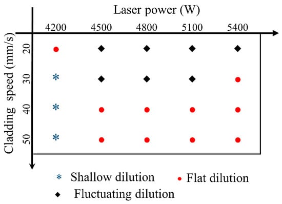 State diagram for dilution of processes under different cladding speeds and laser powers.