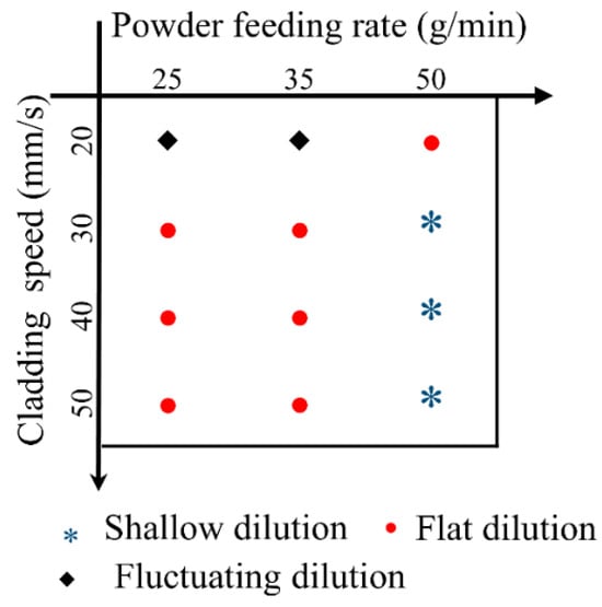 State diagram for dilution of processes under different cladding speeds and powder feeding rates.