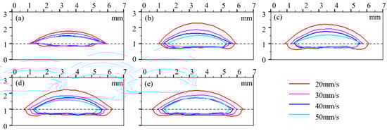 Profiles of the clad under different cladding speeds with laser powers of (a) 4200 W, (b) 4500 W, (c) 4800 W, (d) 5100 W, and (e) 5400 W.