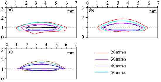 In order to show the variation of the melt pool shape influenced by laser power and cladding speed, the profiles of the melt pool under the same laser power of four variations of cladding speed were plotted in a unified coordinate system within the same Figure, and the results are shown in Figure 10. Similarly, Figure 11 shows the morphologies of the clad under the same powder feeding rate of four variations of cladding speed. It can be seen from Figure 10 and Figure 11 that the effect of cladding speed on the clad morphology is mainly shown in clad height hc and clad width W, while there is a relatively small impact on penetration depth hm. The morphology of the clad is the result of the spatial and temporal evolution of the gas–liquid interface and the solid–liquid interface. The gas–liquid interface is the boundary of the melt pool that accumulates the input of powder materials and laser energy simultaneously. As the speed decreases, the accumulated laser energy for melting and the mass of the powder particles injected per unit of length on the interface reduce, resulting in a high sensitivity of W and hc to the cladding speed.