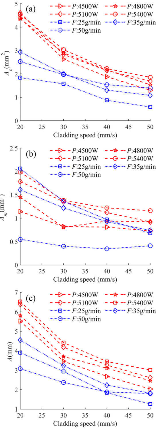 Clad areas of (a) Ac, (b) Am, and (c) A as a function of cladding speed under different laser powers and powder feeding rates.