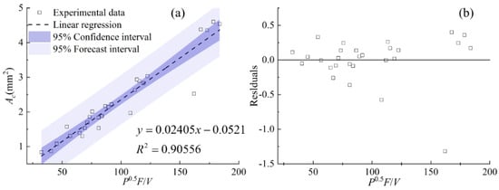 Figure 12 shows the relationship between the area of the clad above the substrate Ac, the area of the molten substrate Am, the total area of the cross section A, and the cladding speed under different process parameters. It can be seen from Figure 12 that with the increase in scanning speed, the clad areas of Ac, Am, and A generally show a decreasing trend, except for Am under the powder feeding rate of 50 g/min. When the powder feeding rate is relatively high, the effect of the cladding speed on Am is slight. The linear regression models between the combined parameters and the clad areas of Ac, Am, and A are an effective way to quantify the process parameters and the clad morphology. Figure 13, Figure 14 and Figure 15 display the statistical reliance of the clad areas of Ac, Am, and A along with the combined parameters. The large values of the linear regression coefficients and the residuals shown in Figure 13b, Figure 14b and Figure 15b testify of the correctness of the linear regression models.