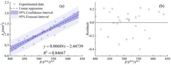 Figure 24 shows the characteristics of D as a function of the combined parameter. It is noticeable that D is directly proportional to the combined parameter P/FV0.2 with a linear regression coefficient of 0.90. The large linear regression coefficient indicates the high reliability of the statistical linear regression model, accompanied by the residuals plot (Figure 24b). The influence indexes of α and β in the linear regression model (PαFβVγ) are equal to 1, meaning the equally important effect of laser power and powder feeding rate when determining D. However, their effect on D is the opposite: with the increase in powder feeding rate, D increases, while D decreases with the increase in laser power. The influence of energy and mass input at the gas–liquid interface on D is a complex process. This is because the behaviors of laser energy input and powder mass addition affect hm and H simultaneously. Thus, the linear regression model provides a quantitative analysis method for predicting D under various processing conditions.