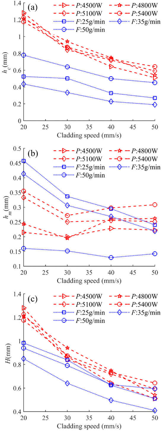 Cladding heights of (a) hc, (b) hm, and (c) H as a function of cladding speed under different laser powers and powder feeding rates.
