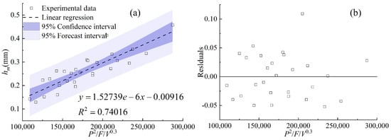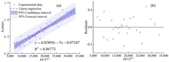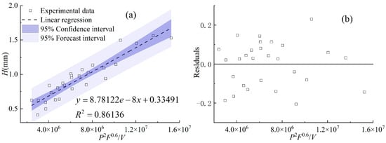 Figure 17, Figure 18 and Figure 19 display the statistical reliance of the heights of hc, hm, and H along with the combined parameters, respectively. It is noticeable that the heights of hc, hm, and H are directly proportional to PF/V0.7, P2/F/V0.3, and P2F0.6/V, respectively, and the regression coefficients are 0.86, 0.74, and 0.86, respectively. The large values of the linear regression coefficients and the residuals plotted in Figure 17b, Figure 18b and Figure 19b testify of the correctness of the linear regression models. It is worth noting that laser power and powder feeding rate both have positive effects on hc and H while holding different weights. Both energy input and mass addition at the gas–liquid interface can increase the accumulation of powder on the melt pool surface, causing an increase in the heights of hc and H. The exponent related to the cladding speed of the combined parameters with the linear regression relationship of hm is 0.3, which is much smaller than that of hc and H, indicating the lower sensitivity of hm to the change of the cladding speed. This is due to the different formation mechanisms of the gas–liquid interface and the solid–liquid interface of the melt pool, which is in agreement with previous works [15,16].