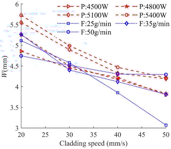Cladding width as a function of cladding speed under different laser powers and powder feeding rates.