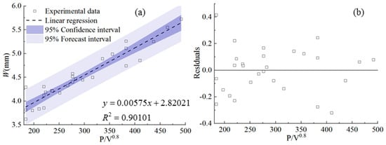 (a) W plotted against combined parameter P/V0.8, (b) the residuals.