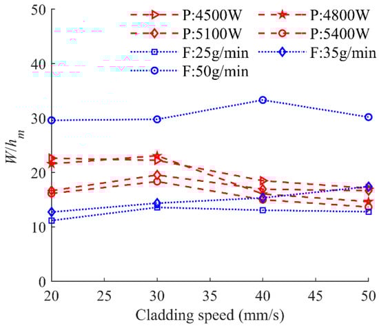 Ratio of W to hm as a function of cladding speed under different laser powers and powder feeding rates.
