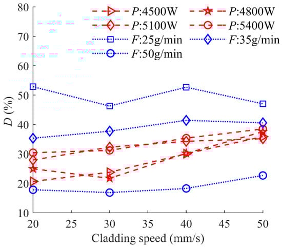 Dilution ratio as a function of cladding speed under different laser powers and powder feeding rates.