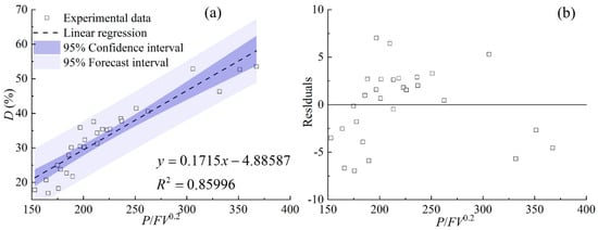 (a) D plotted against combined parameter P/FV0.2, (b) the residuals.