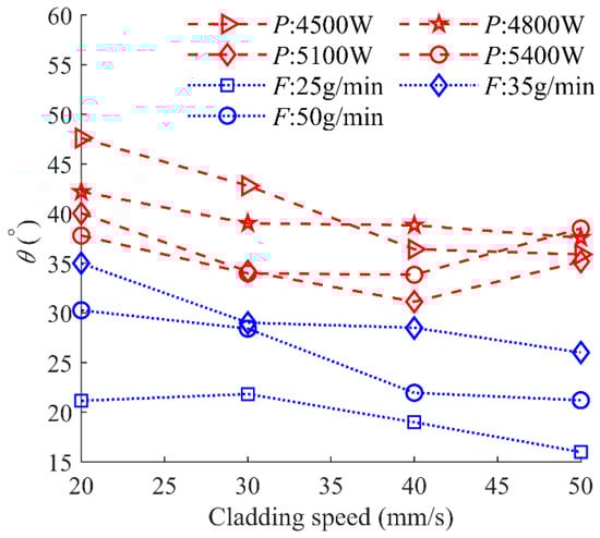 The wetting angle θ is one of the most important characteristics of the clad, because it determines the overlapping morphology of multi-layer clads and the porosity of adjacent clads. According to reference [25], the wetting angle θ can be calculated by the equation written as θ = arctan (2hc/W). In this study, the wetting angles are less than 50°, indicating excellent bonding properties between adjacent clads. Figure 25 shows the behavior of θ as a function of cladding speed under different laser powers and powder feeding rates. There is a slight decrease in the wetting angle with the increase in cladding speed.