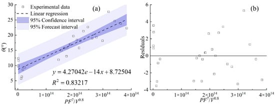 Figure 26 reveals the statistical correlation between the combined parameter PF7/V0.8 and the wetting angle. The correctness of the linear statistical model between the combined parameter PF7/V0.8 and θ is confirmed by a large correlation coefficient of 0.83, along with the distribution of the residuals (shown in Figure 26b). It is noticeable that the index of F is seven times that of P. As a result, it can be concluded that mass addition at the gas–liquid interface plays a major role in the formation of the wetting angle.