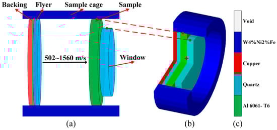 Constructions of the simulation model, including (a) schematic diagram of flyer plate impact, (b) flyer plate impact model constructed in Autodyn (the red star is the gauge), and (c) the material legend.