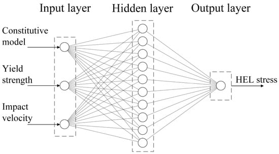 The BP model comprises an input layer, hidden layer, and output layer. The input layer is responsible for acquiring variables, and the hidden layer activates the data from the output layer before transmitting it to the output layer [55,56]. In this study, the types of constitutive models, velocity of impact, and quasi-static yield strength are taken as input variables, with the output being the HEL stress. Thus, the ANN has 3 neurons in the input layer and 1 neuron in the output layer, as illustrated in Figure 2, representing the overall structure of the model.