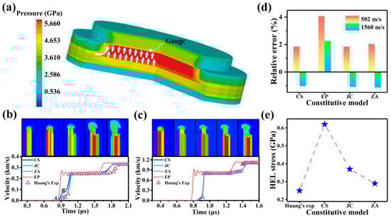 Upon scrutinizing Figure 3b,c, a substantial distinction within the elastic-plastic response of the particle velocity profiles across the simulations using different constitutive models becomes evident. In Figure 3b, segment AB corresponds to the elastic precursor, with point B signifying the HEL. The HEL stress is represented as follows: