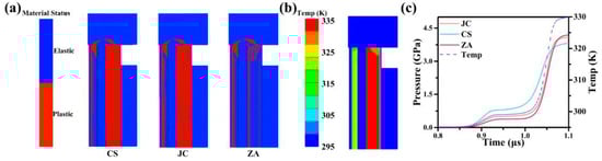 Status of 6061 Al at HEL. (a) The elastic-plastic distribution of 6061 Al at HEL with the CS, JC, and ZA models separately. (b) The temperature distribution of 6061 Al at HEL. (c) The temperature and the pressure of 6061 Al during impact with the three constitutive models separately.