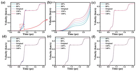 The impact of parameters of the JC model on particle velocity profiles at 502 m/s. (a) The impact of parameter A on particle velocity profiles at 502 m/s. (b) The impact of parameter A on particle velocity profiles at 502 m/s at the elastic-plastic response. (c–f) The impact of parameters B, C, m, and n on particle velocity profiles at 502 m/s.