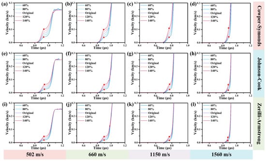 Figure 6 illustrates the influence of with the JC, CS, and ZA models on the particle velocity profiles of 6061 Al at 502, 660, 1150 and 1560 m/s and the red point represents the HEL stress. It is evident that HEL stress increases with the rise in the yield strength at quasi-static, although the three models exhibit different growth trends.