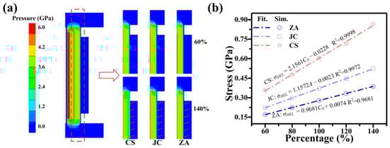 In Figure 7a, the pressure contour reveals that an increase in the yield strength at quasi-static among different models leads to an early rise in pressure at the rear interface of the 6061 Al (highlighted by the red arrows). This phenomenon can be attributed to the heightened yield strength at quasi-static parameters intensifying the propagation of elastic waves during impact. This effect is most pronounced in the results obtained with the CS constitutive model, while it is weakest in the ZA model. Furthermore, the analysis of the constitutive model indicates that the change of yield strength at quasi-static conditions in the ZA model do not significantly affect other parameters, whereas alterations in the coefficients in the JC model and CS model impact the expression of strain-rate and temperature (terms with coefficients greater than 1) in Equations (1) and (2). This may explain why modifying ZA model parameters has the least impact on pressure contour.