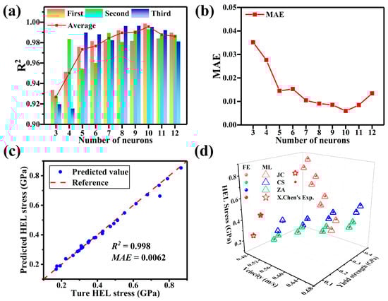 The influence of the numbers of neuron on the (a) coefficients for correlation and (b) MAE. (c) Plot of actual vs. predicted HEL stress for the testing set using the BP model, comparing FE and experimental datasets. (d) A total of 27 groups of predicted results for various.