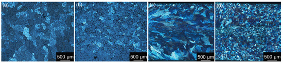 LOM images of materials after annealing at 300 °C/30 min, 450 °C/30 min, and one CGP cycle performed at 300 °C: (a) AlLi MC, (b) AlLiSc MC, (c) AlLi TRC, and (d) AlLiSc TRC.