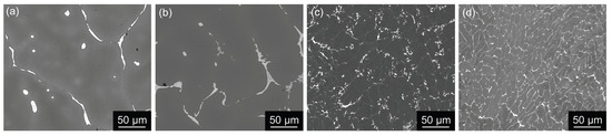 SEM BSE images of eutectic cells in as-cast materials: (a) AlLi MC, (b) AlLiSc MC, (c) AlLi TRC, and (d) AlLiSc TRC, demonstrating a positive influence of TRC and Sc addition on the refinement of the structure.