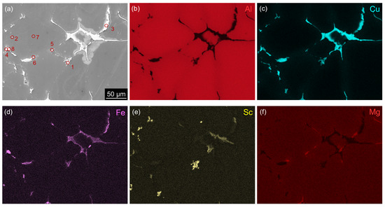 The chemical composition of primary phases was monitored by EDS mapping, disclosing a partially less homogeneous distribution of Sc in the Sc-containing MC material because coarser Sc-rich particles can sporadically be found in the MC alloy (Figure 3). No such particles were found in the TRC AlLiSc material. Only qualitative results in Table 3 do not allow for a direct determination of particular phases due to a strong influence of the surrounding matrix and particles overlapping. However, the primary phases containing the main alloying elements were identified by TEM in our previous studies, showing the presence of stable equilibrium phases , , [55], and [56].